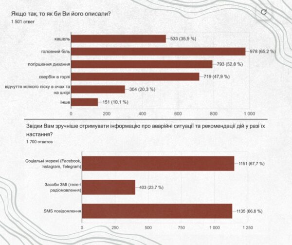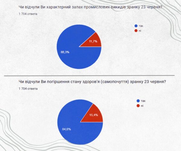 В опитуванні ДТКР взяли участь понад 1700 людей. Понад 85% респондентів відчули характерні запахи в повітрі зранку вказаного дня, а потім – погіршення самопочуття. В переважній більшості випадків люди скаржились на головний біль, погіршення дихання, свербіж у горлі, кашель.