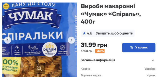 У роздріб пачку 400 г можна знайти по 32 грн з ПДВ. Якщо порахувати, кіло таких макаронних виробів обійдеться у 80 грн з ПДВ.