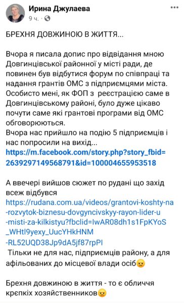 «Особисто мені, як ФОП з реєстрацією саме в Довгинцівському районі, було дуже цікаво почути саме які грантові програми від органів місцевого самоврядування обговорюються…Тільки не для нас, підприємців району, а для афільованих до місцевої влади осіб», — написала підприємниця Ірина Джулаєва.