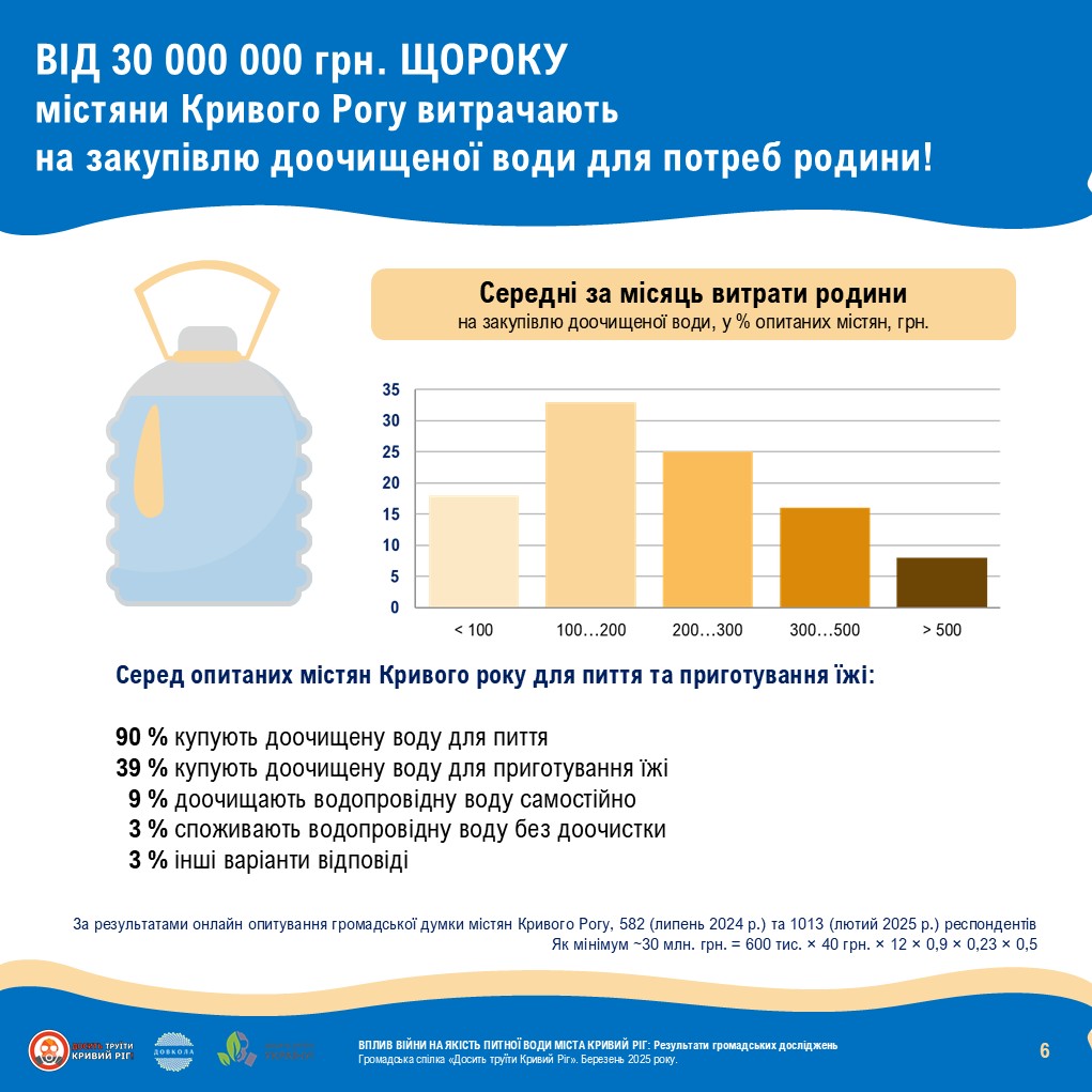 Громадська спілка «Досить труїти Кривий Ріг» дослідила, як вплинуло на побут криворіжців знищення Каховської ГЕС та війна, за допомогою анонімного опитування. За даними екологів, щороку додатково криворіжці витрачають щонайменше 30 млн грн тільки на закупівлю доочищеної води.