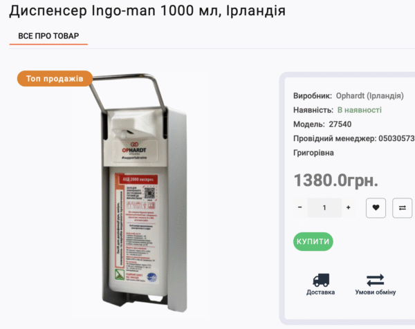 Також лікарня закуповує 175 диспенсерів на 1000 мл ірландського виробництва. У Алли Тарасенко вартість одного перевищує 2270 грн. В інтернеті ми знайшли схожі, теж ірландські, по 1380 грн. Вартість 175 штук сягатиме, за нашими підрахунками, понад 240 тисяч грн, а у Алли Тарасенко – майже 400 тисяч грн. Тобто на 157 тисяч більше.