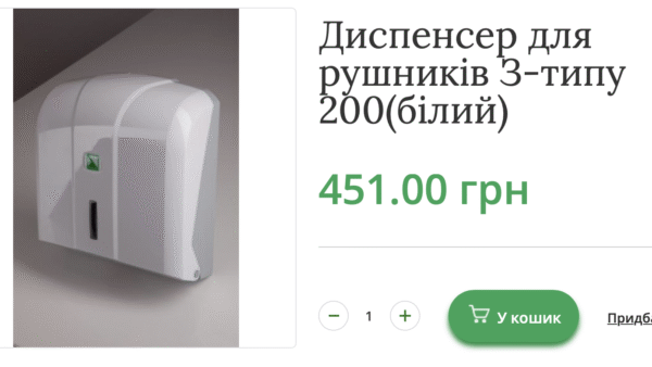 118 диспенсерів для рушників теж турецького виробництва Алла Тарасенко пропонує за 86 тисяч грн або по 733 грн за штуку. В інтернеті ми знайшли схожі по 450 грн. Тобто переплата, за нашими підрахунками, може складати 33 тисячі.