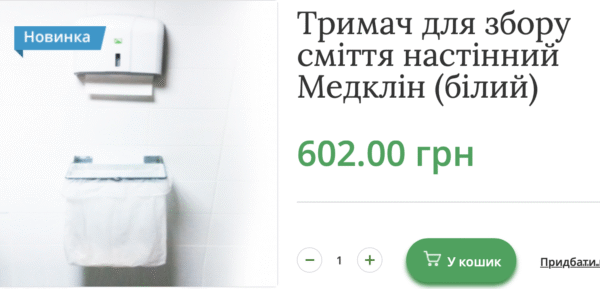 15 білих тримачів настінних Медклін (для збору сміття) можуть обійтися лікарні у майже 15 тисяч грн або по 992 грн за штуку. В інтернеті ми знайшли схожі за 600 грн. За нашими підрахунками, економія може скласти 6 тисяч грн.