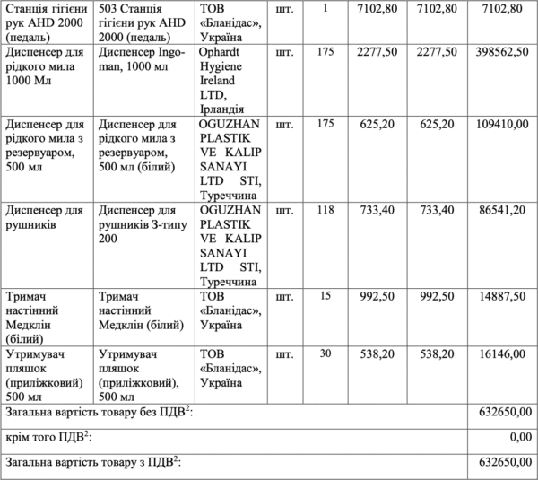 175 білих дозаторів рідкого мила турецького виробництва підприємиця готова поставити за 109 тисяч грн або по 625 грн за штуку. В інтернеті ціни різняться, залежно від моделі – від 141 грн за штуку, до 350 грн. За нашими підрахунками, 175 дозаторів за ціною 350 грн обійшлися б у понад 61 тисячу грн, а це на 48 тисяч менше, ніж у тендері.