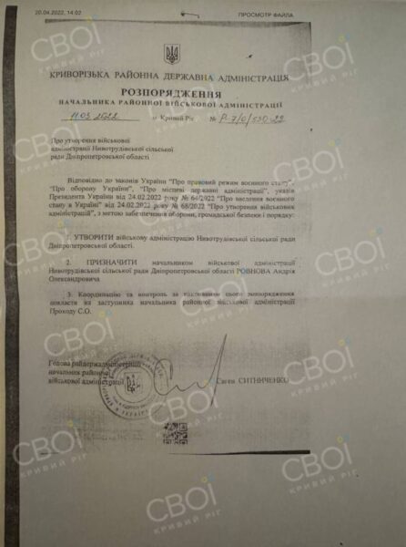 11 березня 2022 року голова Криворізької районної військової адміністрації Євген Ситниченко видав розпорядження про утворення військової адміністрації Нивотрудівської сільської ради Дніпропетровської області. До редакції СВОЇх потрапила копія документа.