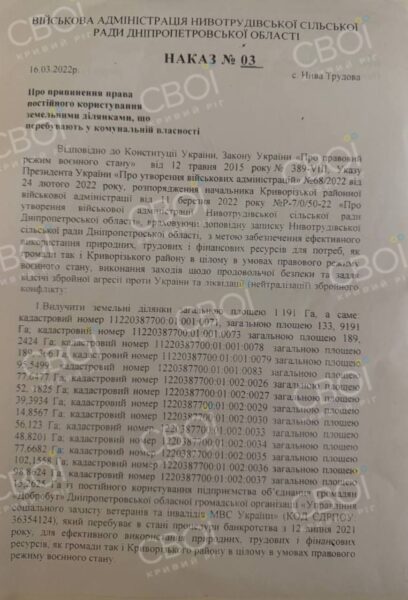 На п’ятий день після утворення військової адміністрації, а саме 16 березня 2022, Андрій Ровнов наказав вилучити 14 земельних ділянок загальною площею майже 1200 гектарів у селі Нива Трудова. Копія документа потрапила до нашої редакції.
