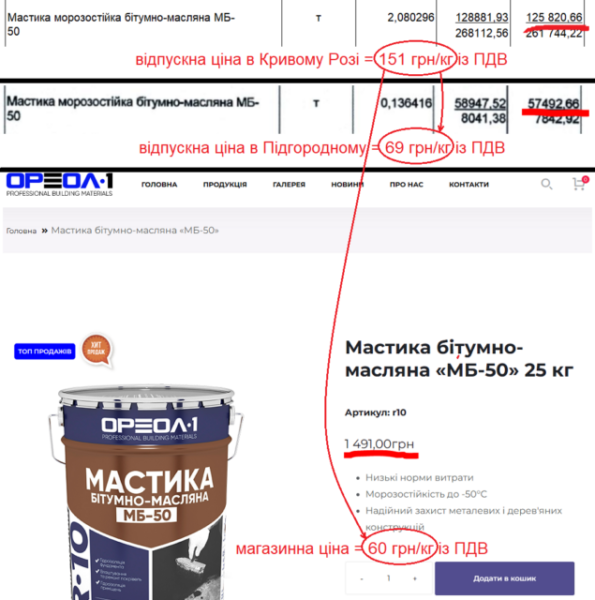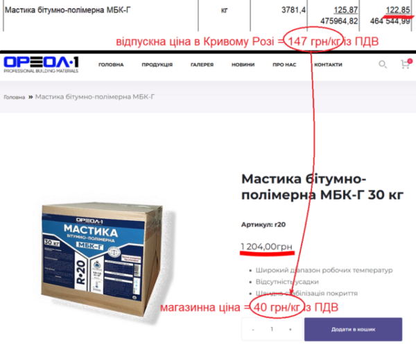 Мастика МБК-Г коштує 147 грн/кг, а МБ-50 – 151 грн/кг. Український виробник «Ореол-1» продає першу втричі дешевше – по 40 грн/кг, а другу вдвічі дешевше – по 60 грн/кг. І на згаданому тендері в Підгородному мастика МБ-50 коштувала 69 грн/кг, що вдвічі дешевше.