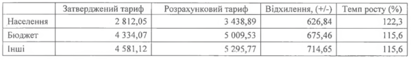 Для населення пропонують тариф: 3424 грн/Гкал з ЦТП та 3167 грн/Гкал без ЦТП (замість 2992 та 2821 грн/Гкал). Таким чином зростання тарифів для потреб населення становить понад 14% та 12% відповідно. Для бюджетних установ – понад 18-20%, для інших споживачів – на понад 32-33%, для релігійних установ – понад 16% без ЦТП.