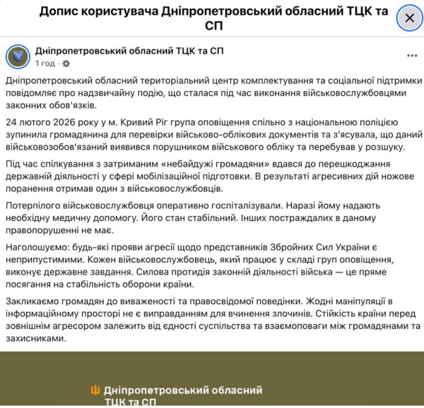 У Покровському районі сталася бійка за участю двох чоловіків (за даними джерел СВОЇх, батька і сина) та військовослужбовців ТЦК. У Дніпропетровському обласному ТЦК та СП підтвердили факт.