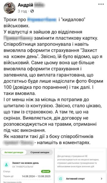 Історію досвіду співпраці з одним із банків розповідає у соцмережі Facebook військовий з Кривого Рогу Андрій Абін. За його словами, співробітниця відділення фінустанови вмовила його оформити страхування під назвою «Захист на кожен день».