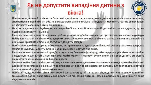 Днями дворічна дитина випала з другого поверху. Через це малюка забрала швидка. У Криворізькому районному управлінні поліції нагадали про правила, які вбережуть дітей від небезпеки.