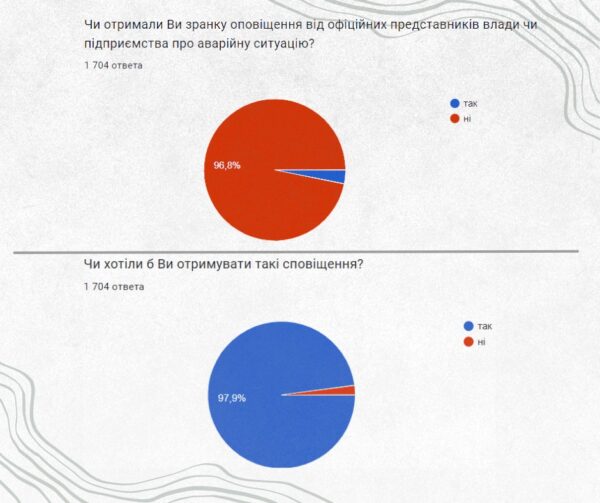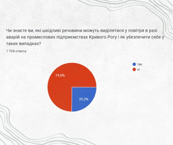 «98% респондентов хотели бы получать такую информацию вовремя, ведь три четверти из них не знают, какие вещества могут выделяться в воздух в случае аварий на промышленных предприятиях Кривого Рога и как горожане могут обезопасить себя в таких случаях. Наиболее желательными каналами распространения информации были названы соцсети (Facebook, Instagram, Telegram) и sms-сообщения»,— подчеркнули в ГТКР.