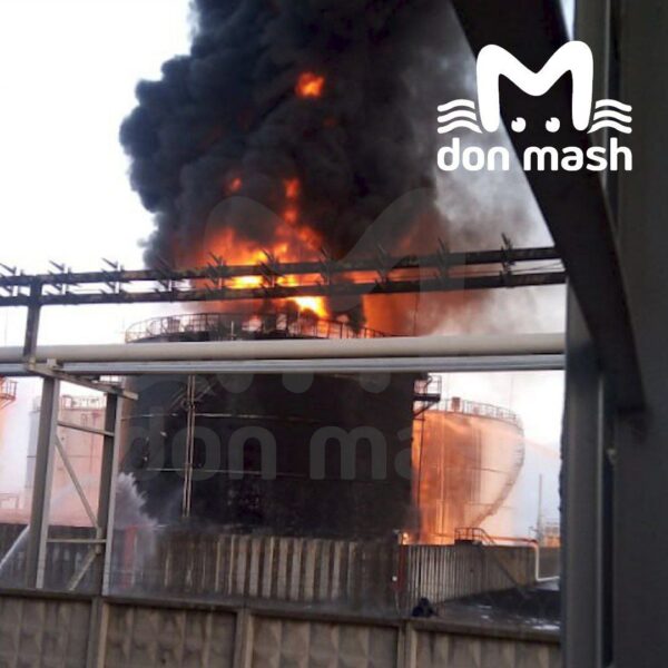 В городе Азов Ростовской области РФ ночью дроны атаковали резервуары с нефтепродуктами. По словам местных жителей, прозвучало не менее 5 взрывов. В результате произошел масштабный пожар.