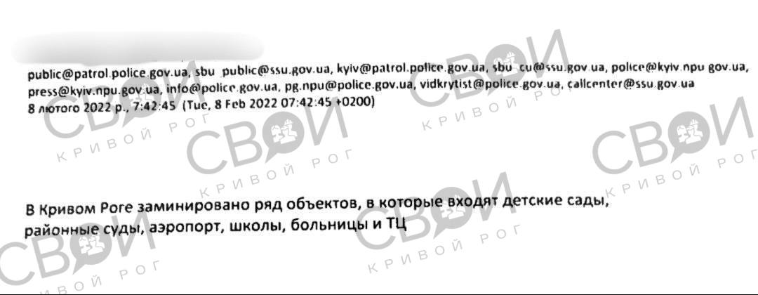 Утром 8 февраля на посту СБУ, Нацполиции и патрульной полиции прислали письмо о возможном минировании объектов инфраструктуры по всему Кривому Рогу.