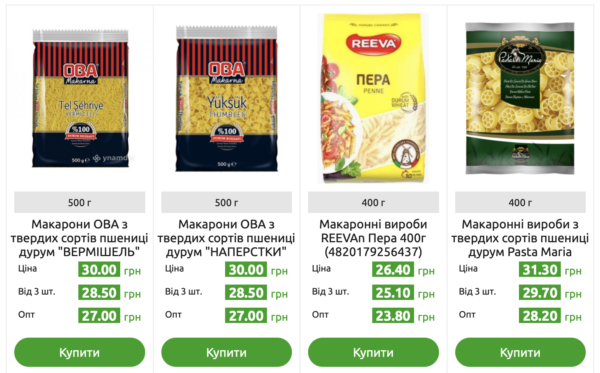 На сайте оптовой торговли мы нашли пачку 500 г макарон из твердых сортов пшеницы от 30 грн с НДС.