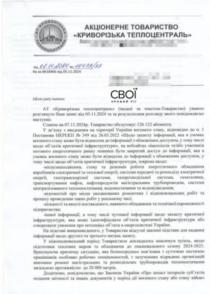 Редакция СВОИХ направила информационный запрос в АО «Криворожская теплоцентраль», которая подчинена Нафтогазу, с наболевшими вопросами относительно отопительного сезона. Также случая с падением мужчины в коммунальную яму, после которого он умер в больнице. Те же вопросы мы поставили лично директору коммунальной «Криворожтеплосети» Сергею Митину. Отметим, руководитель коммунального предприятия был открыт в диалоге с журналистами, в отличие от администрации Теплоцентрали.