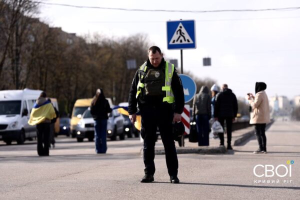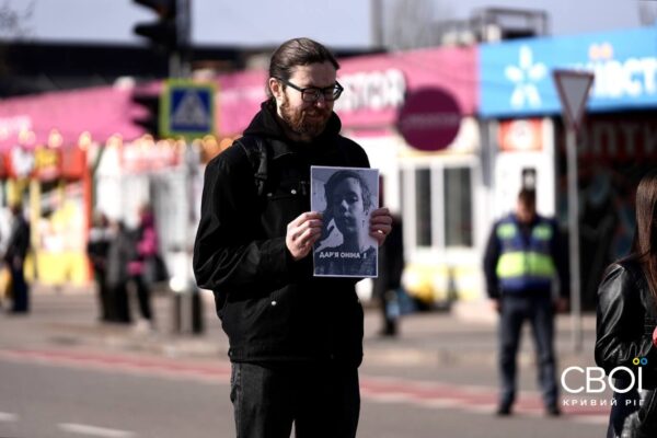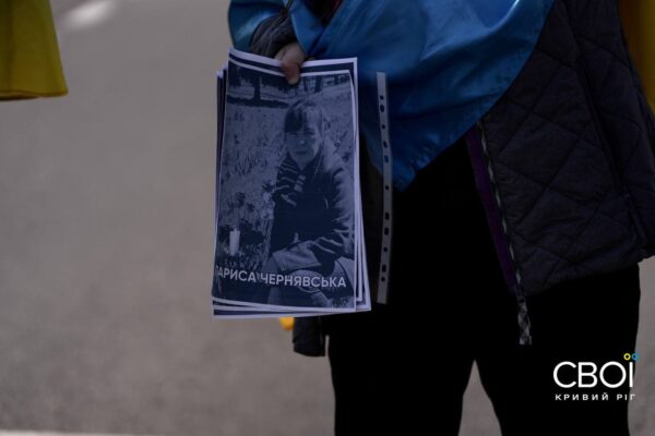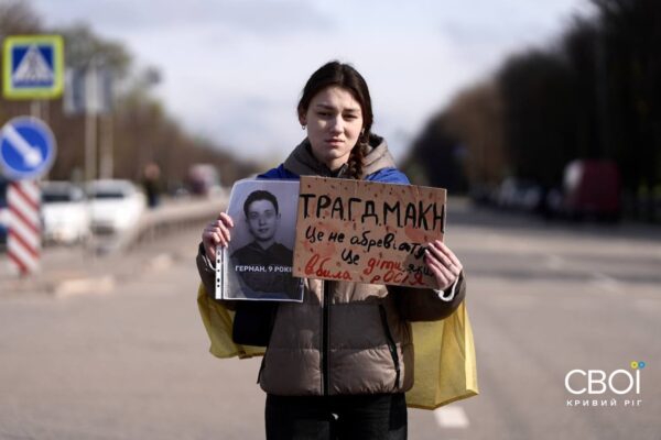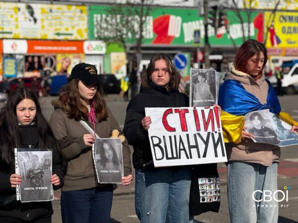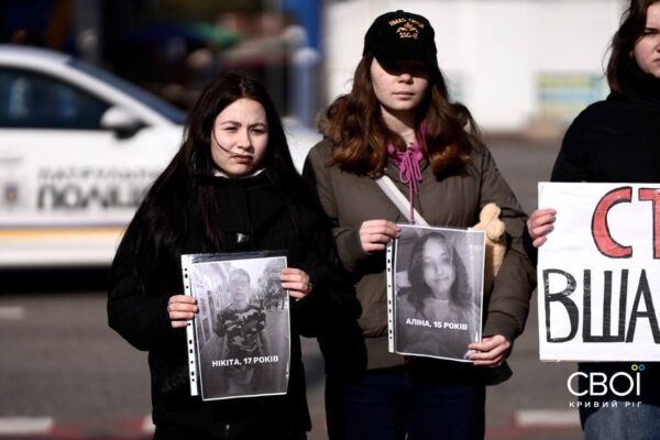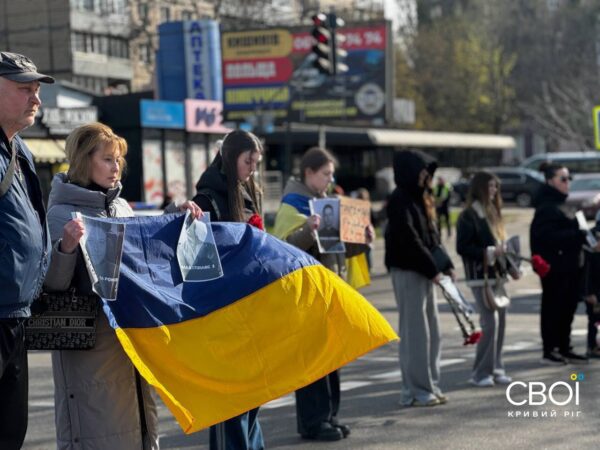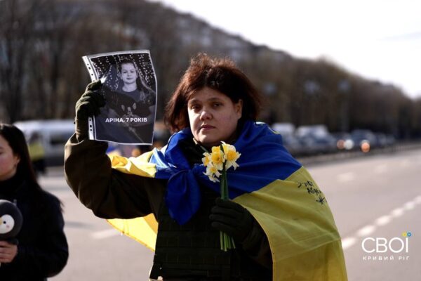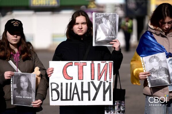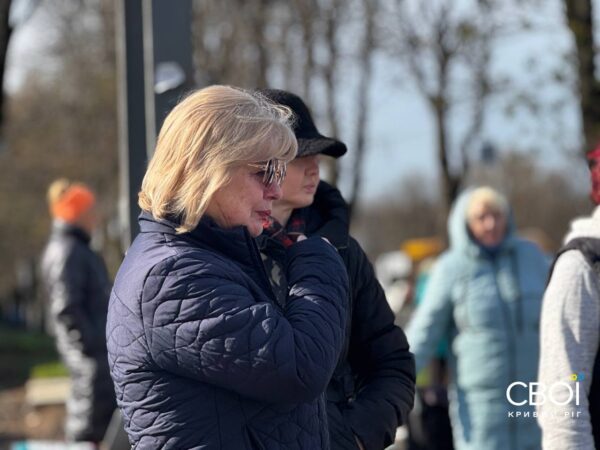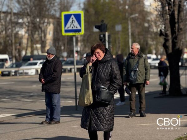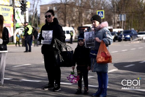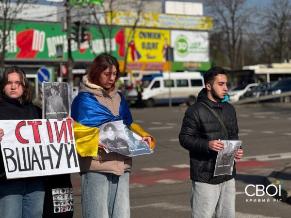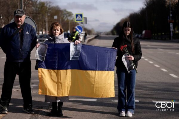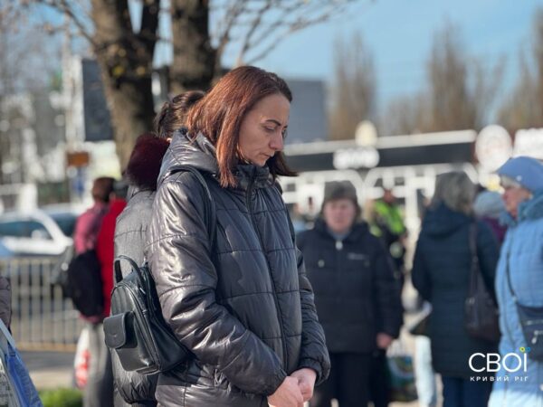 Криворожане вышли на минуту молчания с портретами погибших от ракетной атаки — фоторепортаж