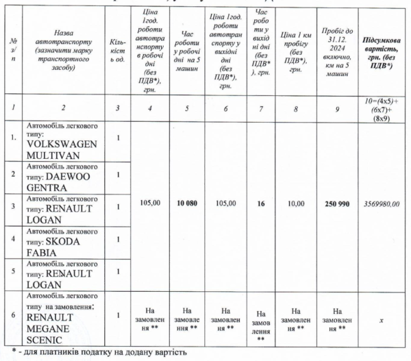 - 3,56 млн грн для Ингулецкого райисполкома за прокат машин Volkswagen Multivan, Daewoo Gentra, два Renault Logan, Skoda Fabia и на заказ Renault Megane Scenic.