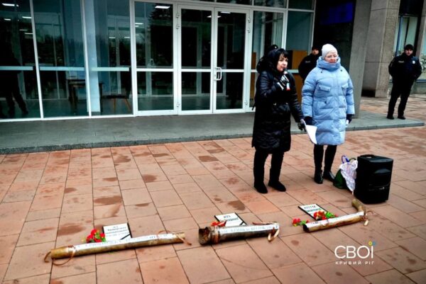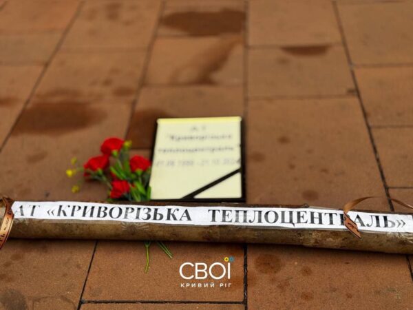 Около 20 человек собрались на митинг возле исполкома, среди них немало председателей ОСМД. Они принесли ржавые трубы и траурные ленты, устроив символическое захоронение трех предприятий, в частности подчиненной Нафтогазу «Теплоцентрали».