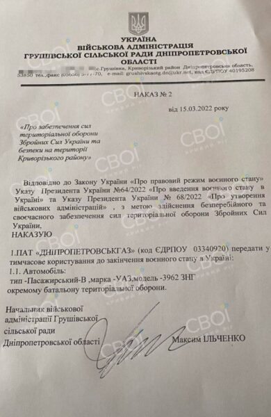 Кроме фейковой Нивотрудовской военной администрации, Ситниченко в начале полномасштабного вторжения создал и Грушевскую военную администрацию. Данный факт подтверждает копия распоряжения, попавшая в нашу редакцию.