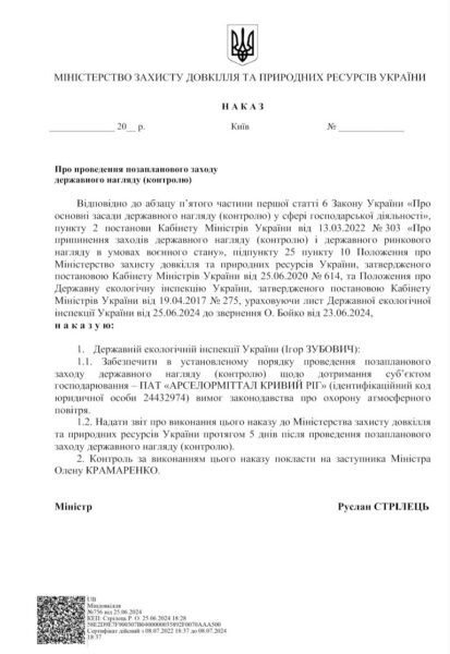 Минприроды приняло решение внепланово проверить соблюдение на коксохимическом производстве ПАО «АрселорМиттал Кривой Рог» законодательства об охране атмосферного воздуха. Соответствующий приказ подписал Министр Руслан Стрелец.