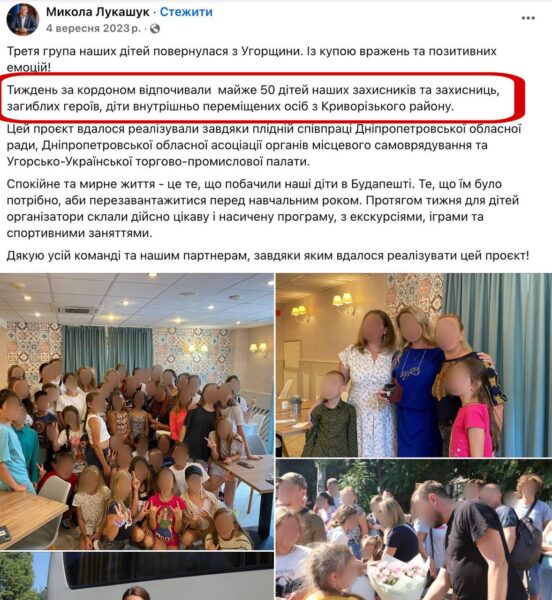 Летом 2023 года детей из Криворожья отправляли на отдых в Венгрию. Путевки должны были получить более сотни детей из семей участников боевых действий, погибших защитников, многодетных семей, внутренне перемещенных лиц. Об этом дважды отчитывался председатель Днепропетровского облсовета от партии «Слуга народа» Николай Лукашук на собственных страницах в соцсетях.