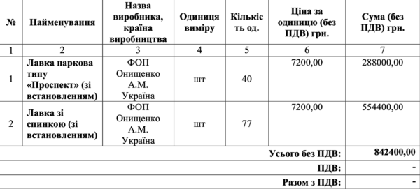 На тендер пришли два участника и электронная система выбрала самое дешевое предложение ФЛП Онищенко Анна Николаевна. У нее стоимость одной скамейки с установкой достигает 7200 грн.